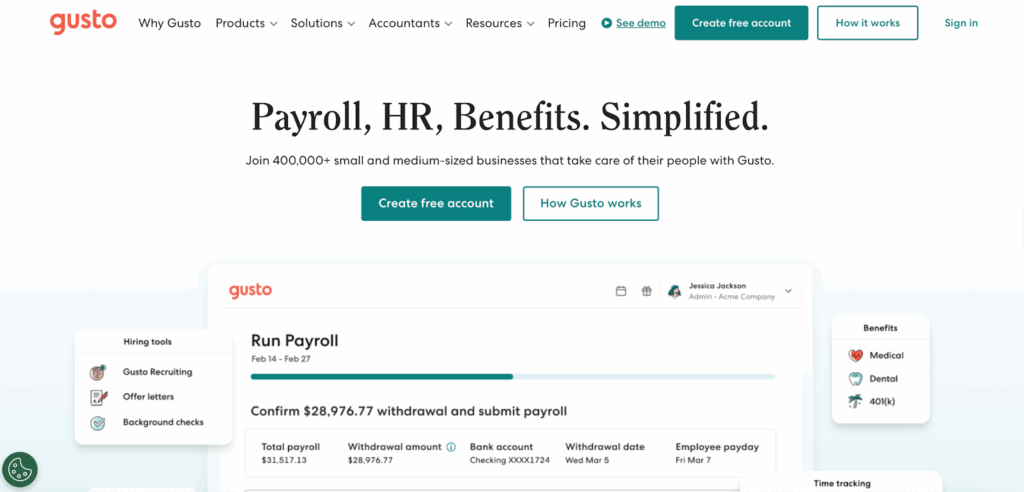 - Employee-focused features like advances, savings goals, and Gusto Wallet